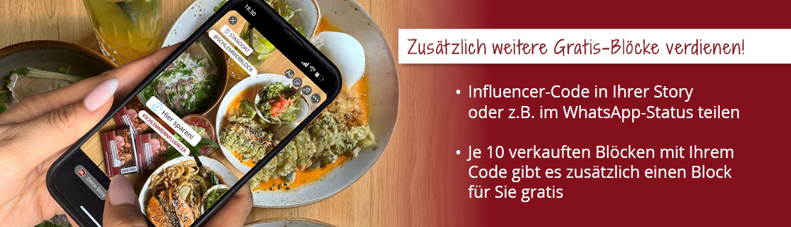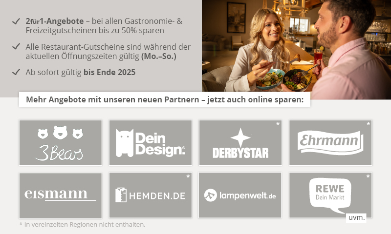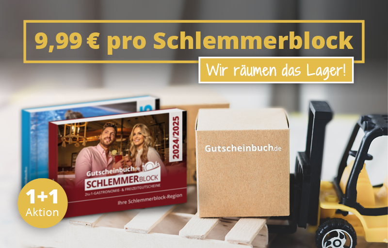 Aktuelle Preise für die Auflage 2025 Schlemmerblock 2025 und Freizeitblock 2025 ab 1 Stk. je 19,99 € + 1 Gratis-Block 2025 nach Wahl (umgerechnet je 9,99 € pro Block 2025) 1+1 Aktion Pro bezahltem Schlemmerblock 2025 oder Freizeitblock 2025 erhalten Sie einen Block 2025 nach Wahl gratis. Versandkostenfrei Aktion nur gültig für die Schlemmerblock-Auflage 2024/2025 und die Freizeitblock-Auflage 2025. Limitierte Auflage – solange der Vorrat reicht. UVP: 44,90 €. Alle Preise inklusive MwSt. Schlemmerblock 2024/2025 und Freizeitblock 2025 gültig bis 1. Dezember 2025. Alle Schlemmerblöcke 2024/2025 und Freizeitblöcke 2025 können gemischt werden. |