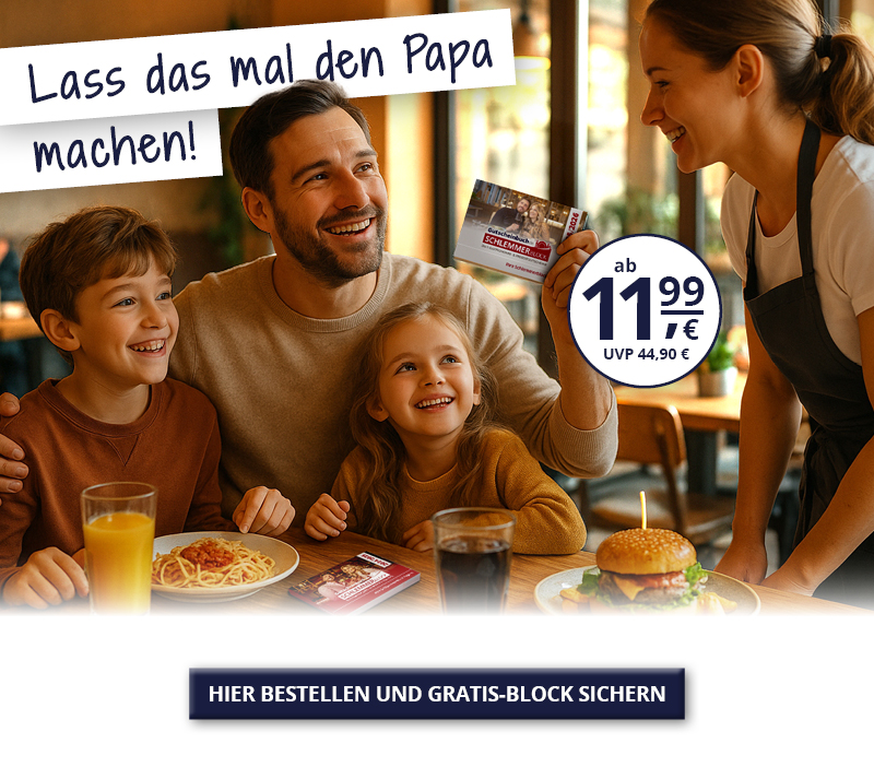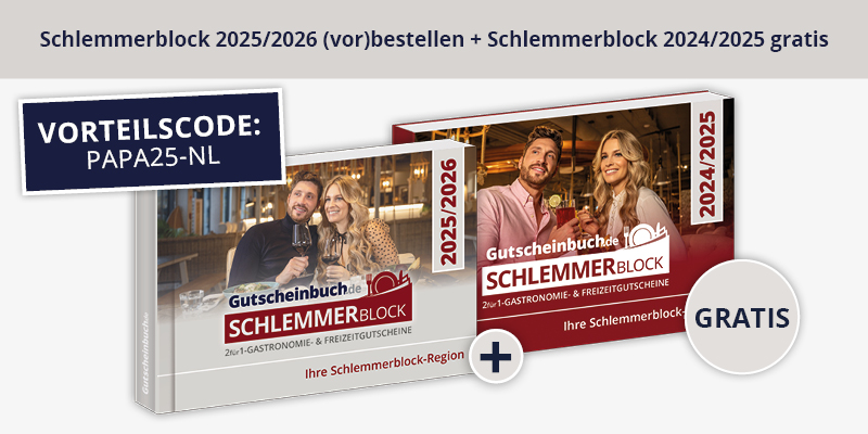 Aktuelle Preise für die Auflage 2025/2026 Schlemmerblock 2025/2026 – Megadeal mit Best-Preis-Garantie ab 1 Stk. je 25,99 € + Versand 3,96 € = Gesamtpreis 1 Block 29,95 € + 1 Gratis-Schlemmerblock 2024/2025 ab 3 Stk. je 16,99 € + Versand 3,96 € = Gesamtpreis 3 Blöcke 54,93 € + 3 Gratis-Schlemmerblöcke 2024/2025 ab 6 Stk. je 11,99 € + Versand 0,00 € = Gesamtpreis 6 Blöcke 71,94 € + 6 Gratis-Schlemmerblöcke 2024/2025 Versandkostenfrei ab 6 Stück Limitierte Auflage – solange der Vorrat reicht. UVP: 44,90 €. Alle Preise inklusive MwSt. Schlemmerblock 2025/2026 gültig bis 01. Dezember 2026. Schlemmerblock 2024/2025 und Freizeitblock 2025 gültig bis 01. Dezember 2025. Alle Schlemmerblöcke und Freizeitblöcke der jeweiligen Auflage können gemischt werden. |