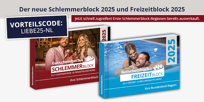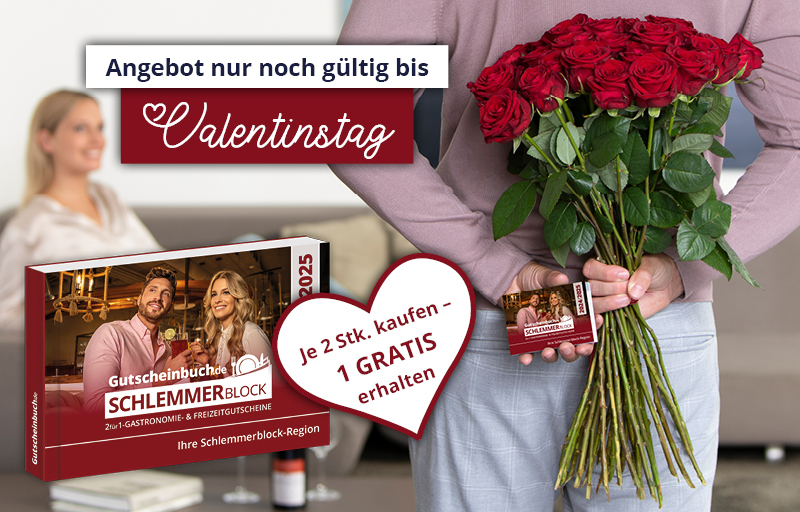 nutzen Sie die Chance noch bis zum 14. Februar und profitieren Sie von unserer exklusiven Valentinstags-Aktion! Genießen Sie unvergessliche Momente zu zweit, denn gemeinsame Zeit ist das schönste Geschenk! Mit dem Schlemmerblock 2025 genießen Sie und Ihre Lieblingsmenschen das ganze Jahr über kulinarische Highlights und sparen dank unseren exklusiven 2für1-Gutscheinen dabei noch die Hälfte. Und das Beste: Sichern Sie sich zwei Schlemmer- oder Freizeitblöcke 2025 und erhalten dank unserer 2+1-Valentinstags-Aktion einen weiteren Block Ihrer Wahl für Sie und Ihre Liebsten gratis dazu. Verpassen Sie nicht diese einmalige Gelegenheit – einige Regionen sind bereits ausverkauft! Sichern Sie sich jetzt das Angebot, bevor es zu spät ist! Ihre Anna Schwientek von Gutscheinbuch.de |